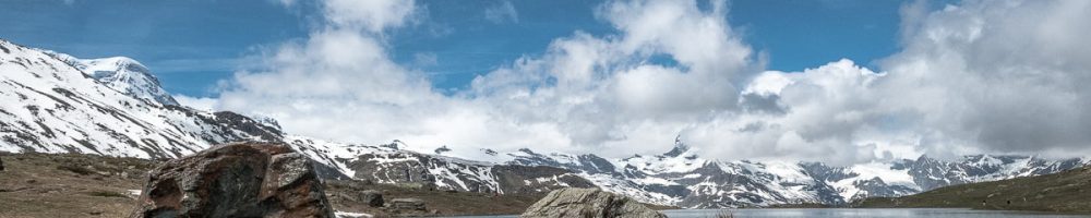 Auch wenn eine Windbrise die Spiegelungen auf der Wasseroberfläche praktisch verunmöglicht, und das Matterhorn von dichten Wolken umgeben ist – das Landschaftsbild da oben ist einfach wunderschön. Ok, man ist mit den anderen Touristen sicherlich nicht ganz allein, und die Ruhe wird ab und zu von bellenden Hunden oder herumfliegenden Drohnen getrübt. Dennoch behalte ich eine sehr positive Erinnerung an diesen Bergsee an einem schönen Panoramaweg von Zermatt. Hier geniessen wir dann auch unsere erste grössere Zwischenverpflegung und beobachten das lustige Treiben der asiatischen Touristen beim Posieren und Fotografieren.