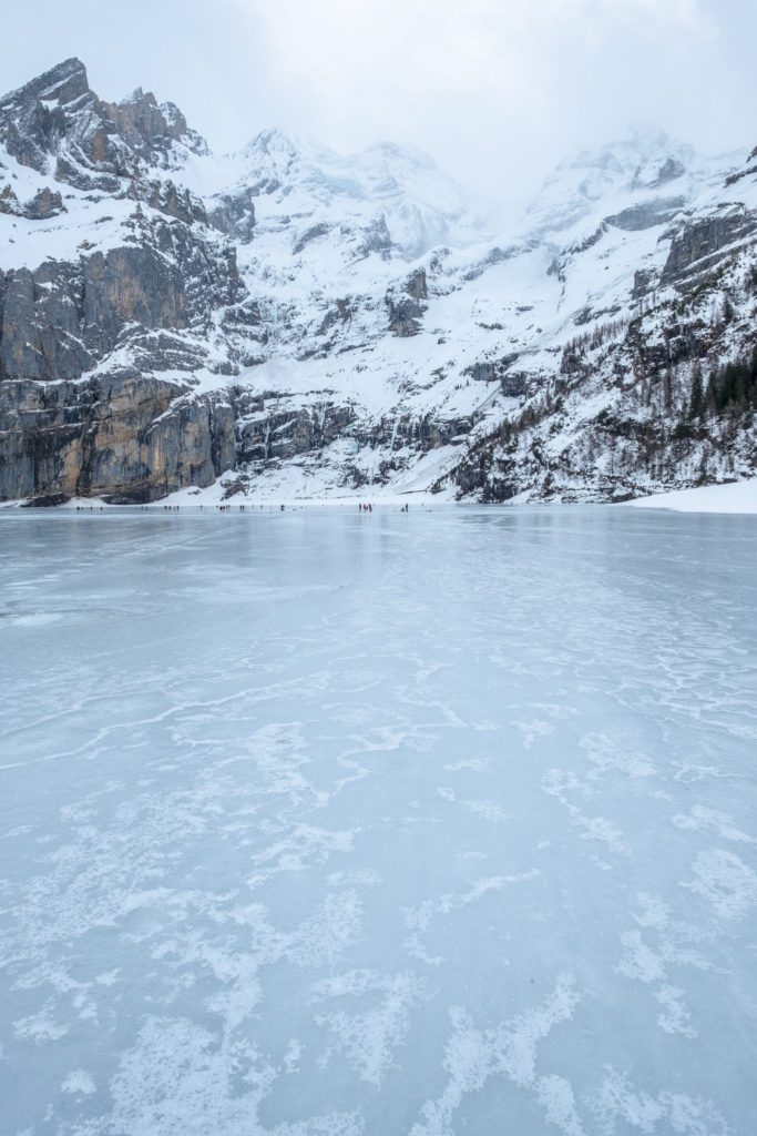 Ein eher seltenes Spektakel ist wieder aktuell. Der Oeschinensee oberhalb von Kandersteg im Berner Oberland ist vollständig zugefroren und für Liebhaber des Schlittschuhlaufens freigegeben. Als ich davon erfuhr, wusste ich: Das wird mein Sonntagsausflug. Eine der imposantesten und schönsten Natureisbahnen der Schweiz ist nämlich ein idealer Tagesausflug für die ganze Familie. Die imposante Kulisse des Sees, das schwarze und trübe Eis umgeben von den Berner Bergketten, ist insbesondere bei schönem Wetter eine wahre Augenweide. Doch auch beim heutigen grauen Wetter wurde ich vom Panorama wiedermal entzückt.